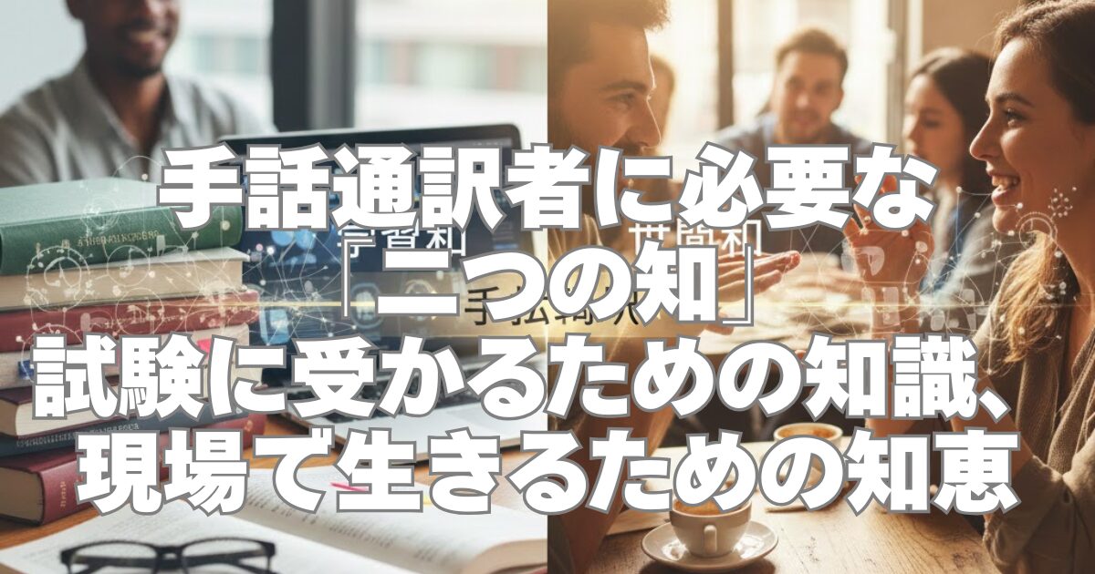 手話講習会に通い、何年もかけて技術を磨き、難関の試験を突破する。 それは並大抵の努力ではありません。 しかし、晴れて通訳者・通訳士として現場に立ったとき、多くの人が一つの壁にぶつかります。 「教科書通りにいかない」 「言葉は通じているはずなのに、何かが噛み合わない」 そんなとき、鍵を握るのが「学習知」と「世間知」という二つの視点です。 目次 1. 学習知:通訳の「土台」を作るもの 2. 世間知:現場で「橋渡し」をするもの 二つの知が組み合わさるということ 現場に出る前に、何ができるか? 結びに 1. 学習 ...