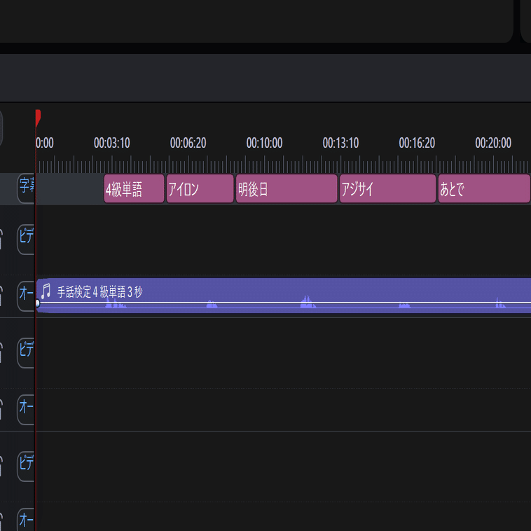 上のパワーディレクターの画像。紫の声の波形に対してピンクの字幕のタイミングが全くあっていません。(AIだろ!ちゃんとやってよ)それを三百数十回手直しします。